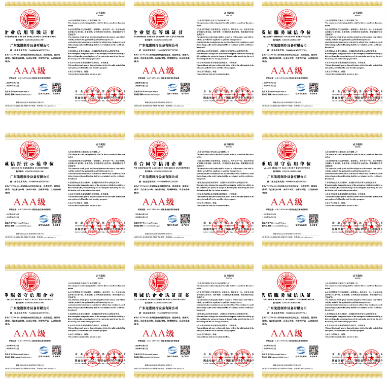 “3A级十证一牌”认证体系是衡量企业综合竞争力的黄金标准,广东先进制冷以全优表现通过严苛评审,核心认证包括: