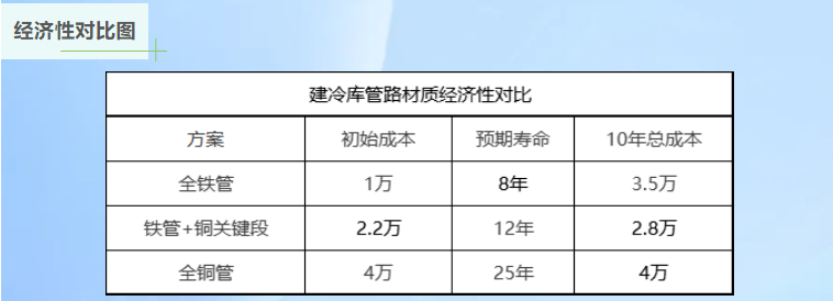 在施工强度面,需完全抽空系统→切割旧管网(可能含危险锈渣)→酸洗管路→氩弧焊铜管(比铁管焊接耗时增加40%)。另外还有较高的隐性成本,停机损失造成冷库无法使用的损失,另外维修需要制冷剂重注(R404A单价约¥300/kg)。